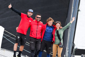 Le 21 août dernier, sur un enfournement dans des conditions assez musclées, Ronan Treussart a chuté à l’intérieur du bateau. Au repos forcé, l’équipier ne pouvait continuer les manœuvres: Christopher Pratt et Robin Follin ont poursuivi en double dans des conditions musclées. Et comme une mauvaise nouvelle n’arrive jamais seule, à moins de 24hde leur arrivée, Christopher annonçait à la Direction de course une avarie sur le bateau. Après plusieurs heures de navigation dans le front causé par la tempête Ernesto – 40 nœuds de vent, 4 mètres de mer – le flotteur bâbord, probablement déjà fragilisé, a lâché sous l’effet des chocs répétés. Durant 300 milles, il a fallu ralentir, surveiller, stresser. Les voici à bon port, soulagés et classés sur la première Route des Terre-Neuvas !